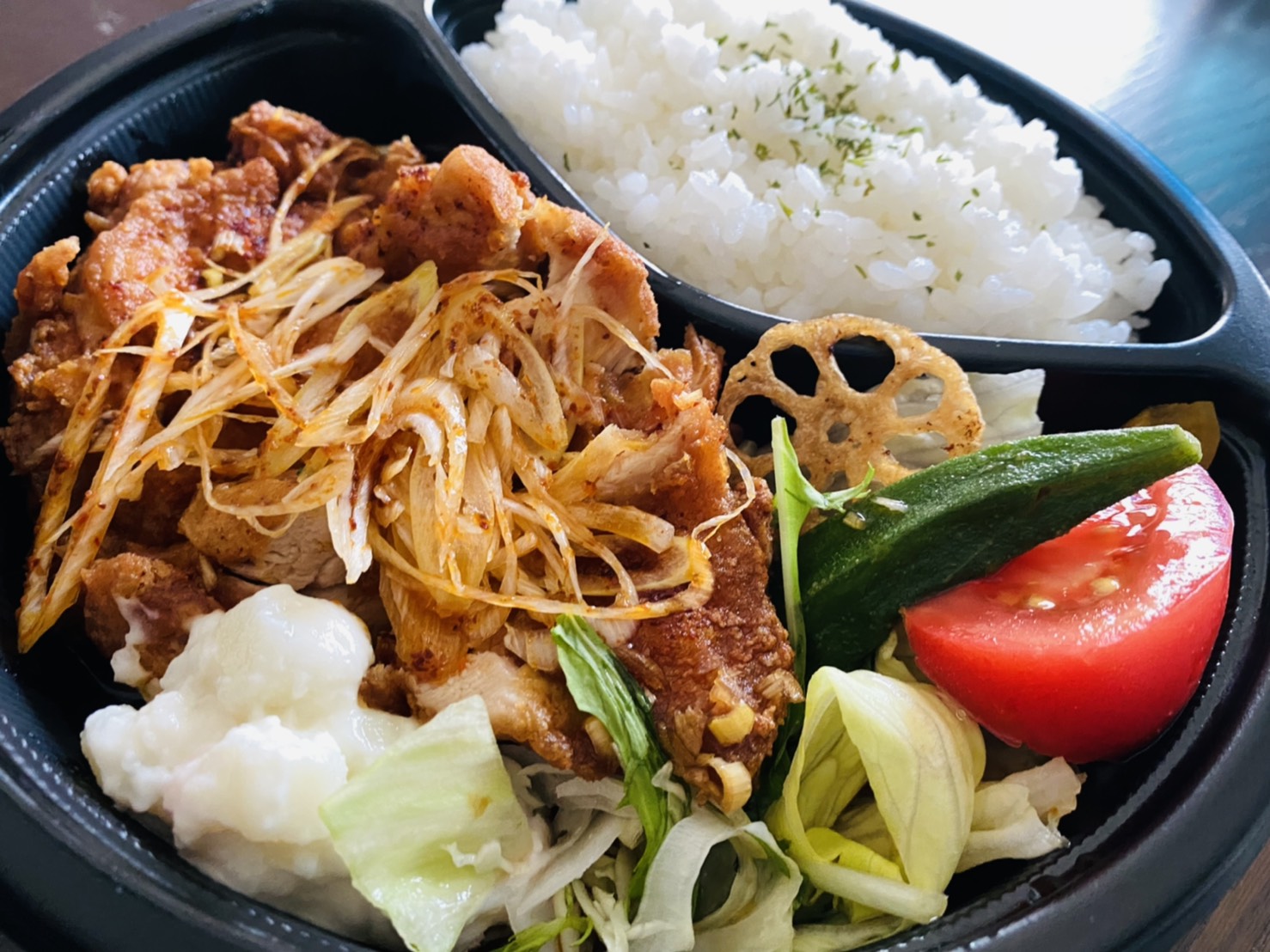 新町チキンさんで注文した、「赤辛油淋鶏弁当」! ピリッと辛くて、すごく美味しかったです!! 今度はガパオライスを頼んでみようと思います♪