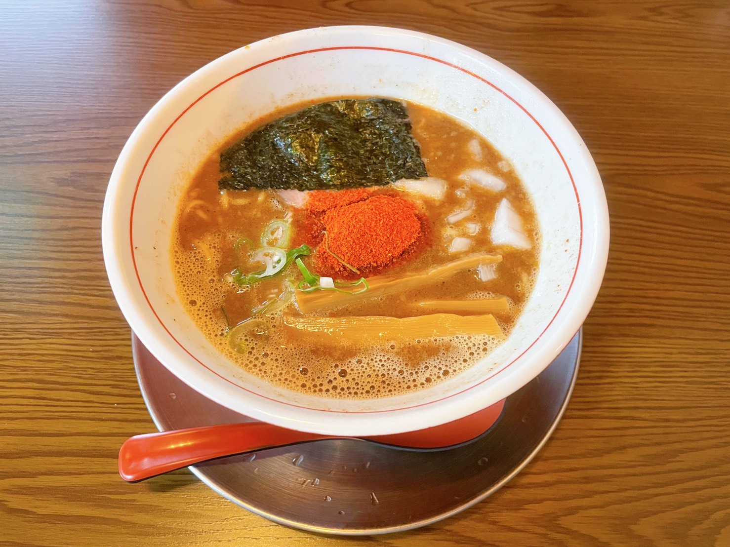 私の辛そばは表面が赤くて辛そうです。こりゃ食べる前から期待大です。