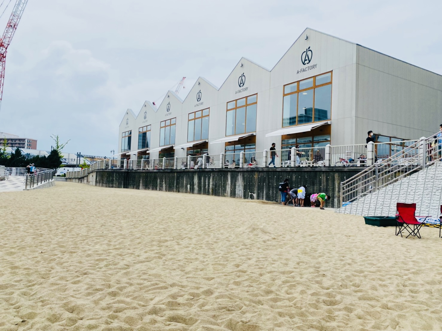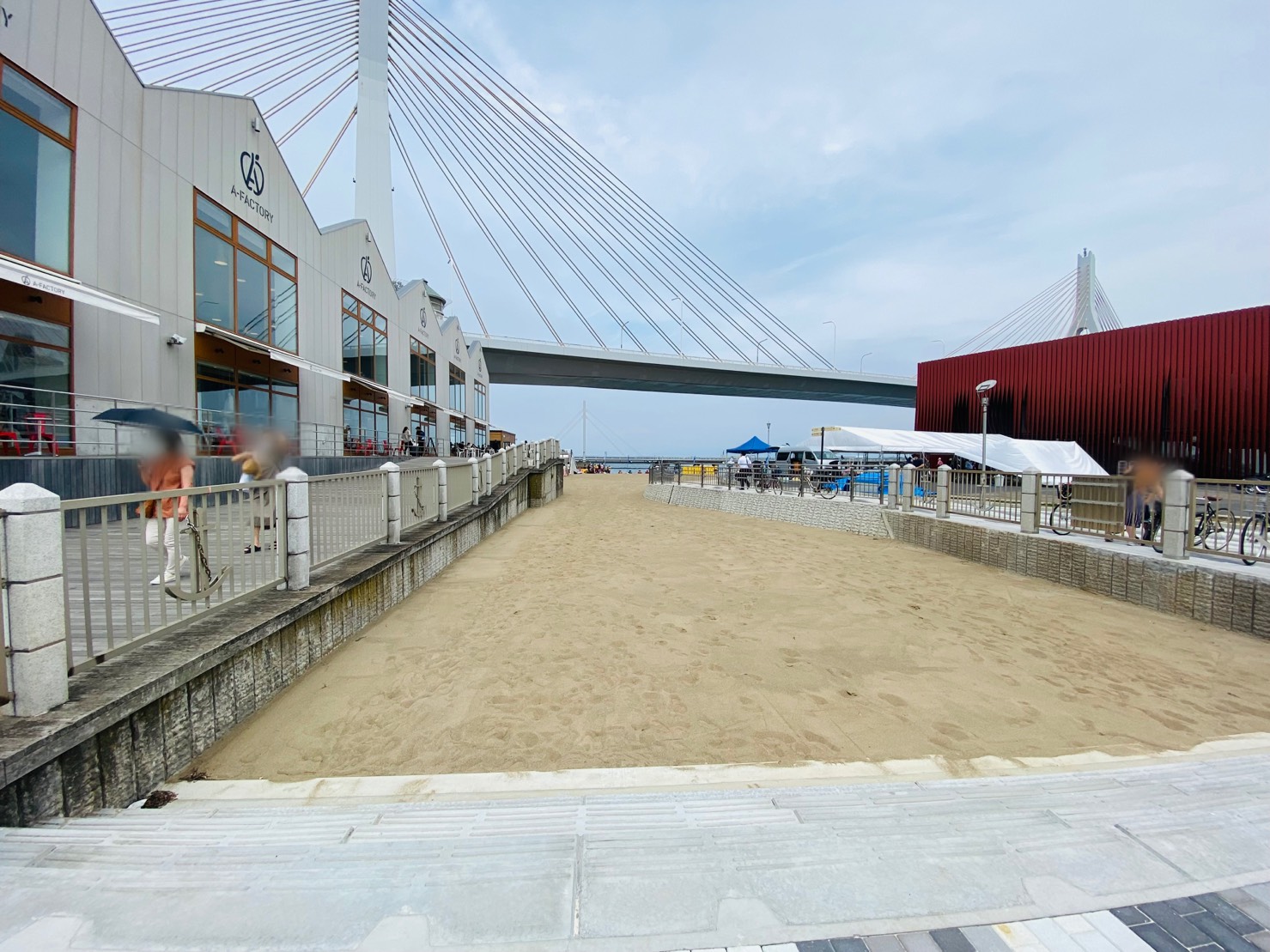 A-FACTORY側に進むと、看板が見えます。そして階段を降ると……突然砂浜が始まります!
