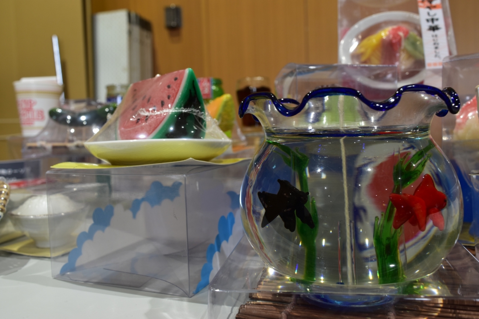 ・スイカなど本物そっくりの『好物ローソク』の展示