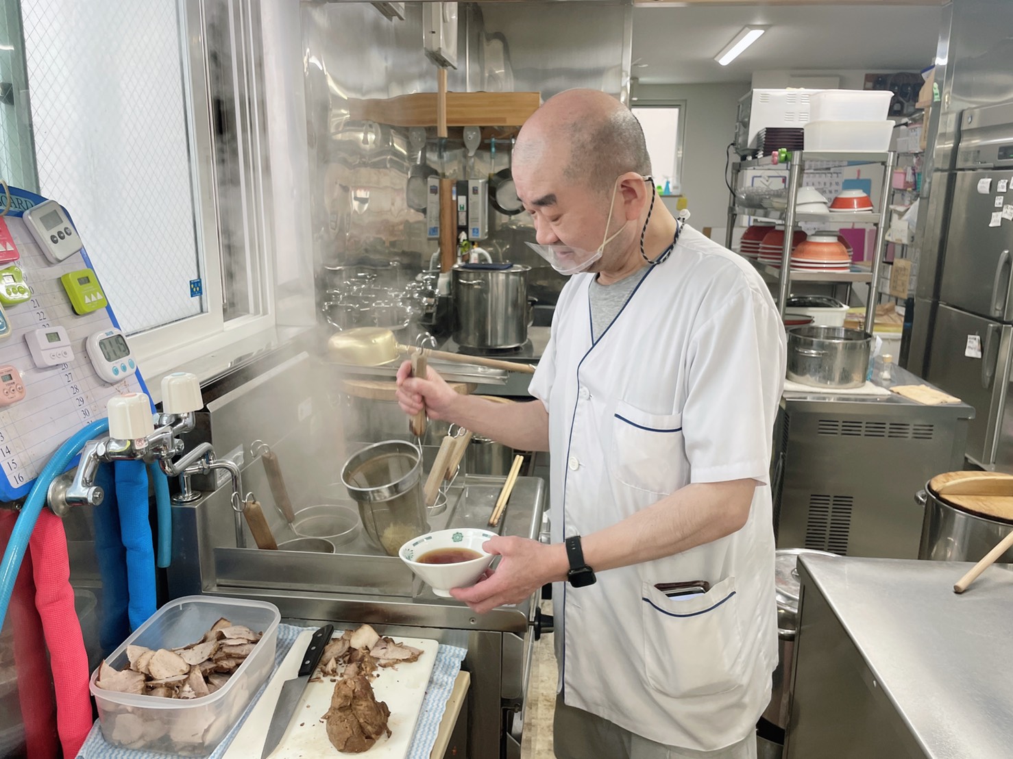 だしの「ダブルスープ」です。魚介と豚・鶏からとったものを入れています。まったく添加物の入らない、あっさりした飽きのこない味を目指しているそうです。先代の頃から少しずつ味は変化しているとのことで、その背景には焼き干しの価格高騰など、さまざまな理由がありますが、変化を遂げながら新しいラーメンを作っているのだそうです。