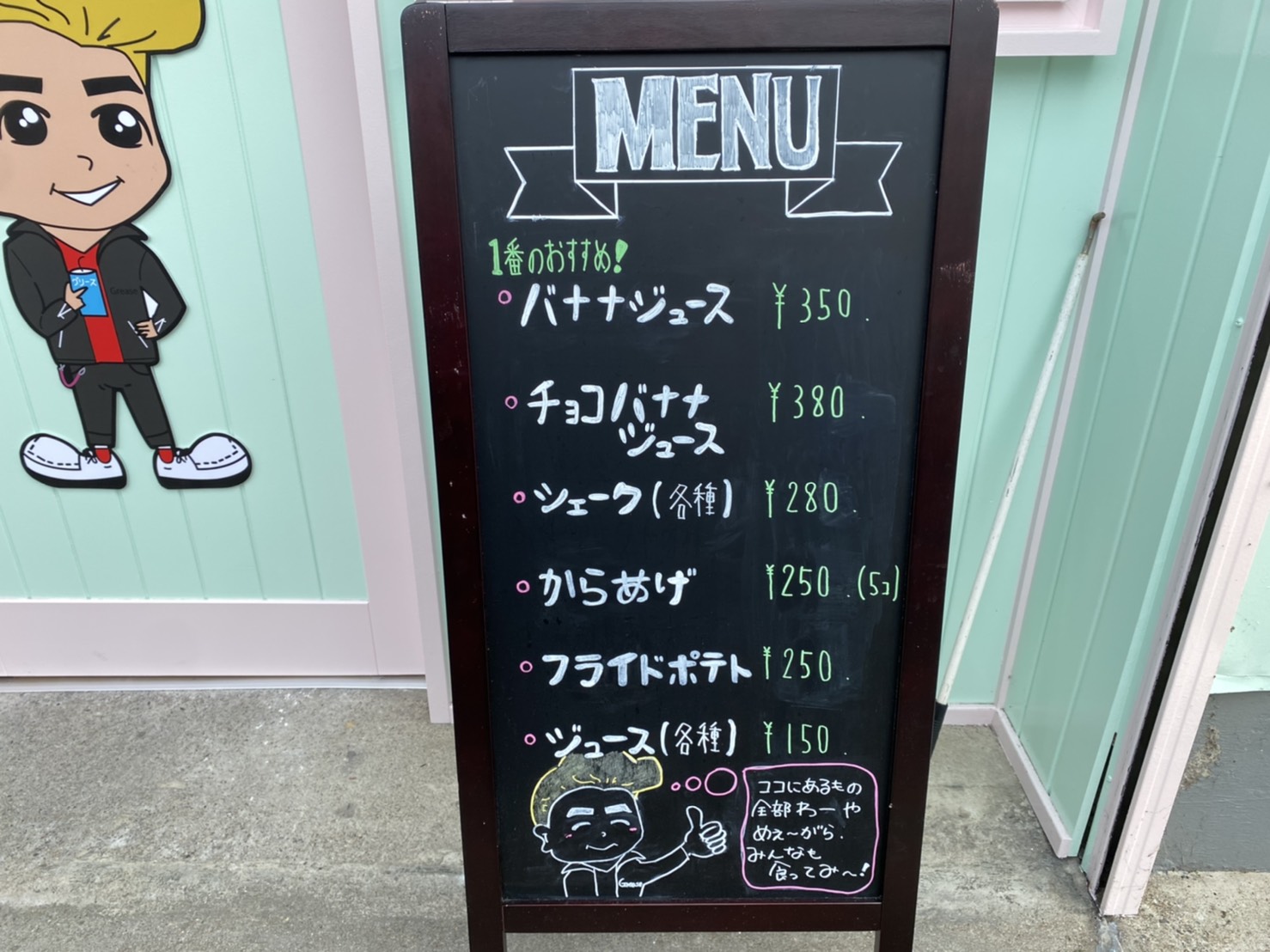 実は、車で何度もお店の前を通っていて、壁が可愛く装飾されていたので「なにかオープンするのかな?」とは思っていたのですが、まさかジュース屋さんだったとは!