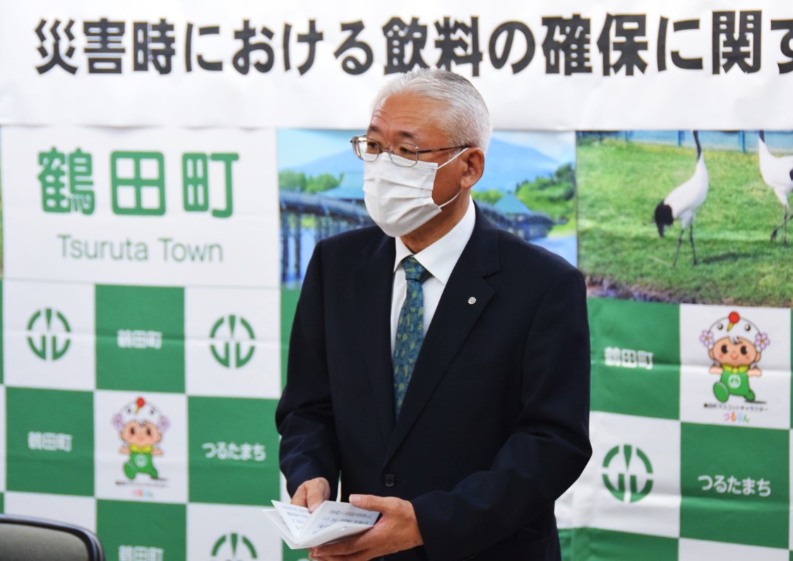 「近年は大規模災害が多発し各地で甚大な被害をもたらすことが多くなりました。今年7月には鶴田町が友好交流協定を締結している鹿児島県薩摩町に大雨特別警報が発令され、平年の1ヶ月分の雨量を超える500ミリメートル以上の大雨となり、床上浸水や土砂崩れ、農地の土砂流入など多くの被害をもたらしました。交流を続けている自治体で災害が発生したことで、改めて防災対策の一層の強化に取り組んでいく決意を新たにしたところでございます。本日の協定締結を機に、災害発生時の心強い味方になる、みちのくコカ・コーラボトリング様との協力関係を深め、災害対策の充実に努めてまいります。」