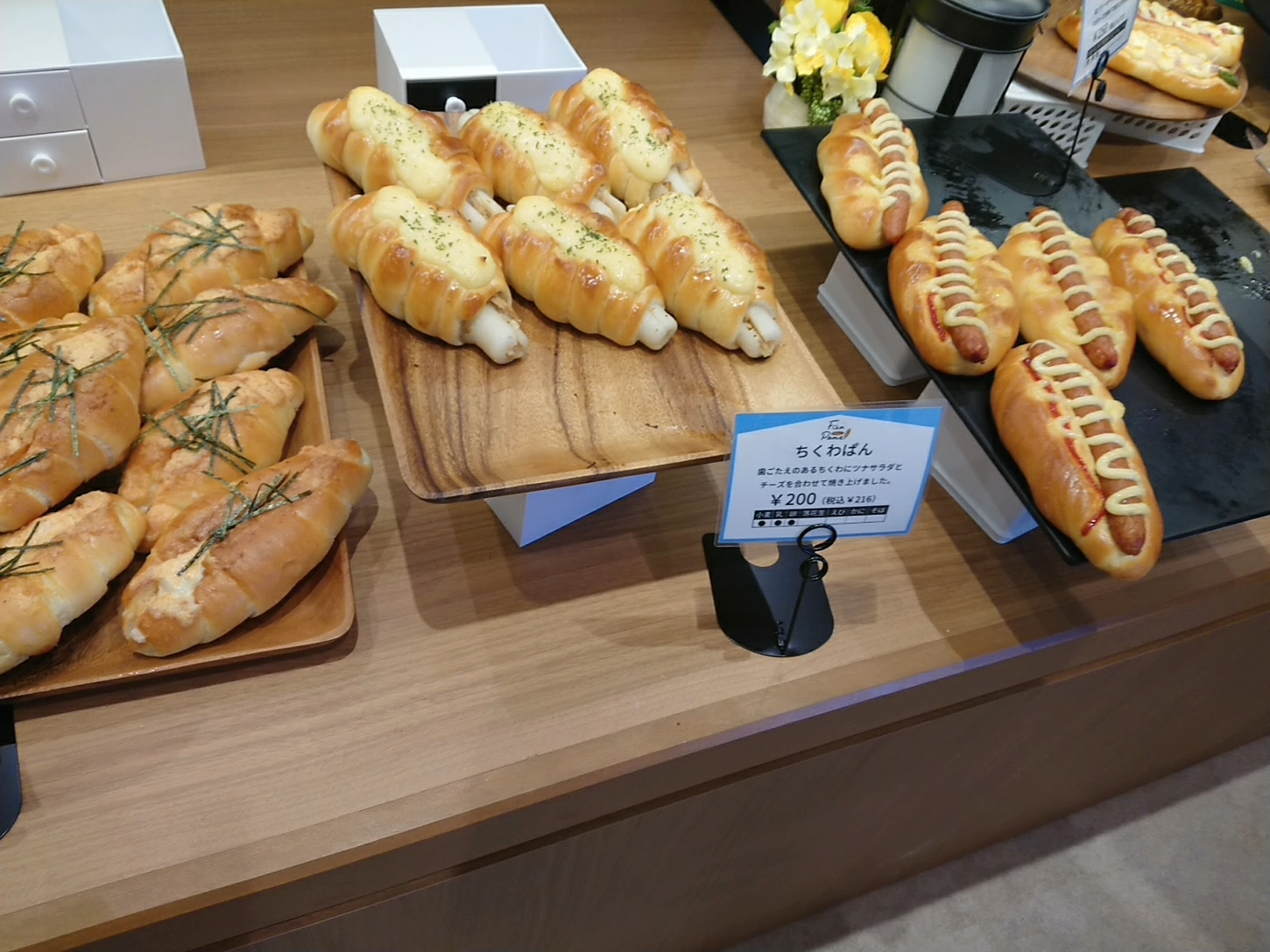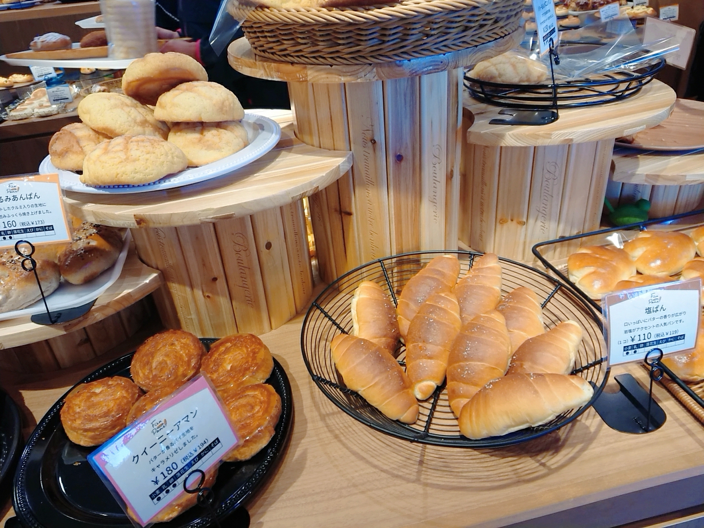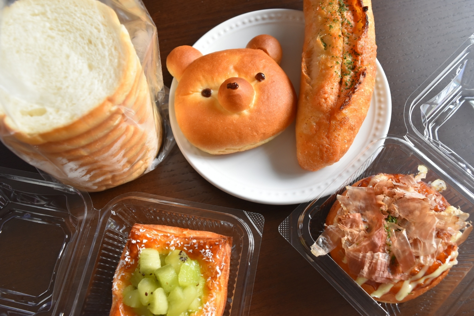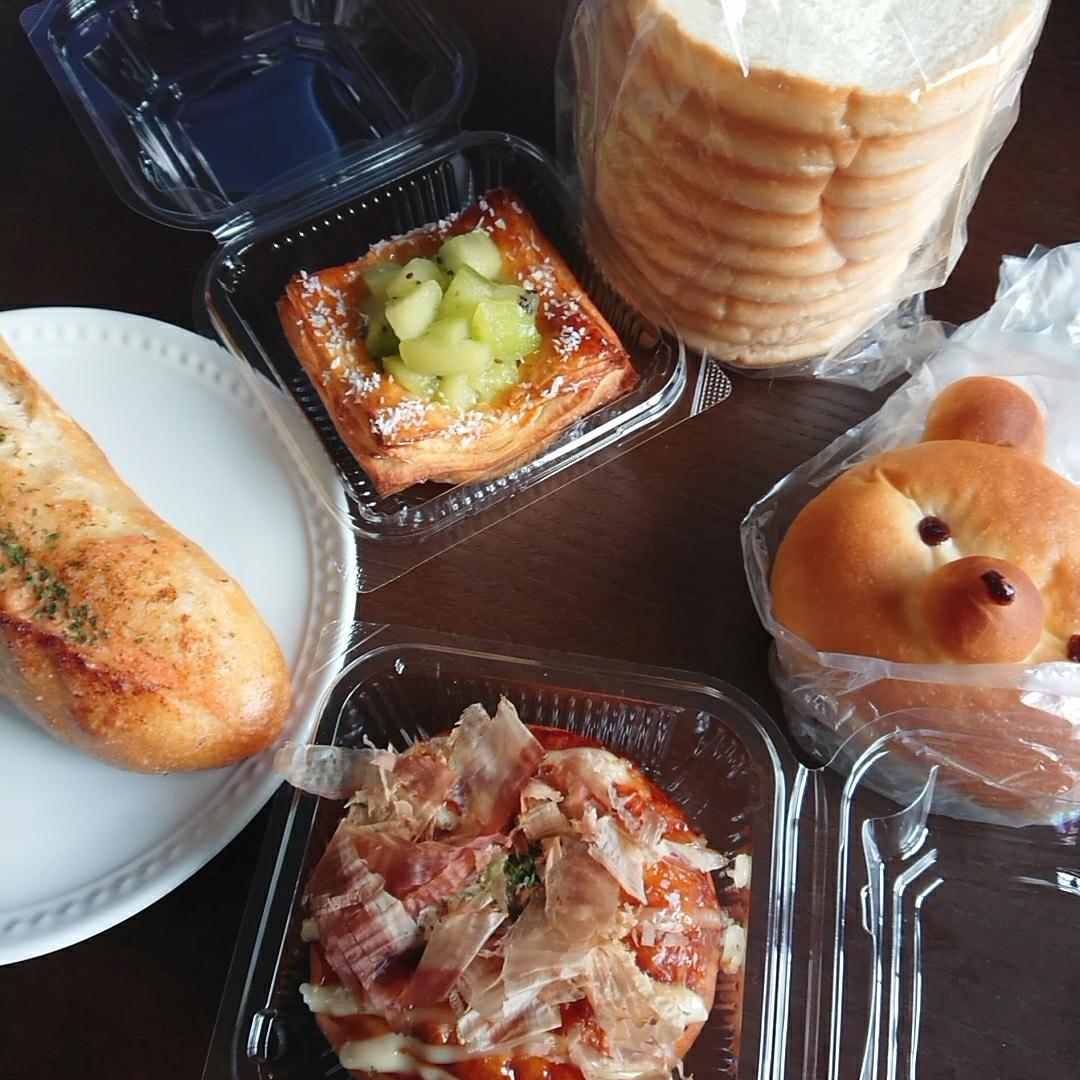 【たこあげぱん】、【森のくまさん(はちみつ)】、【キウイデニッシュ】、【明太フランス】、【?(円柱のパン!商品名を見てくるの忘れてしまいました、、)】です!