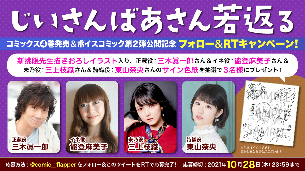 コミックフラッパー編集部の公式Twitter(@comic__flapper)をフォローし、所定のキャンペーンツイートをRTすると、抽選で3名様に、新挑限先生描きおろしイラストが入った、正蔵役:三木眞一郎さん、イネ役:能登麻美子さん、未乃役:三上枝織さん、詩織役:東山奈央さんのサイン色紙があたるプレゼントキャンペーンを実施!