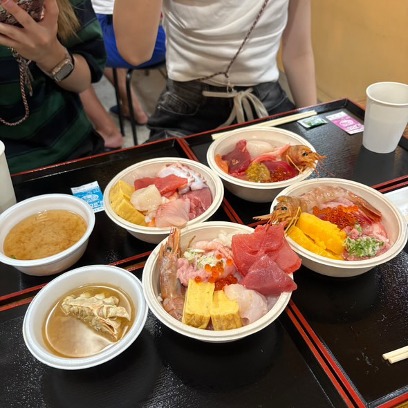 まず食券(バラ売り券)を購入し、ご飯を受け取る、あとは市場内を歩きながら好きな具材を選び、丼にのっけていくというシンプルなものです。